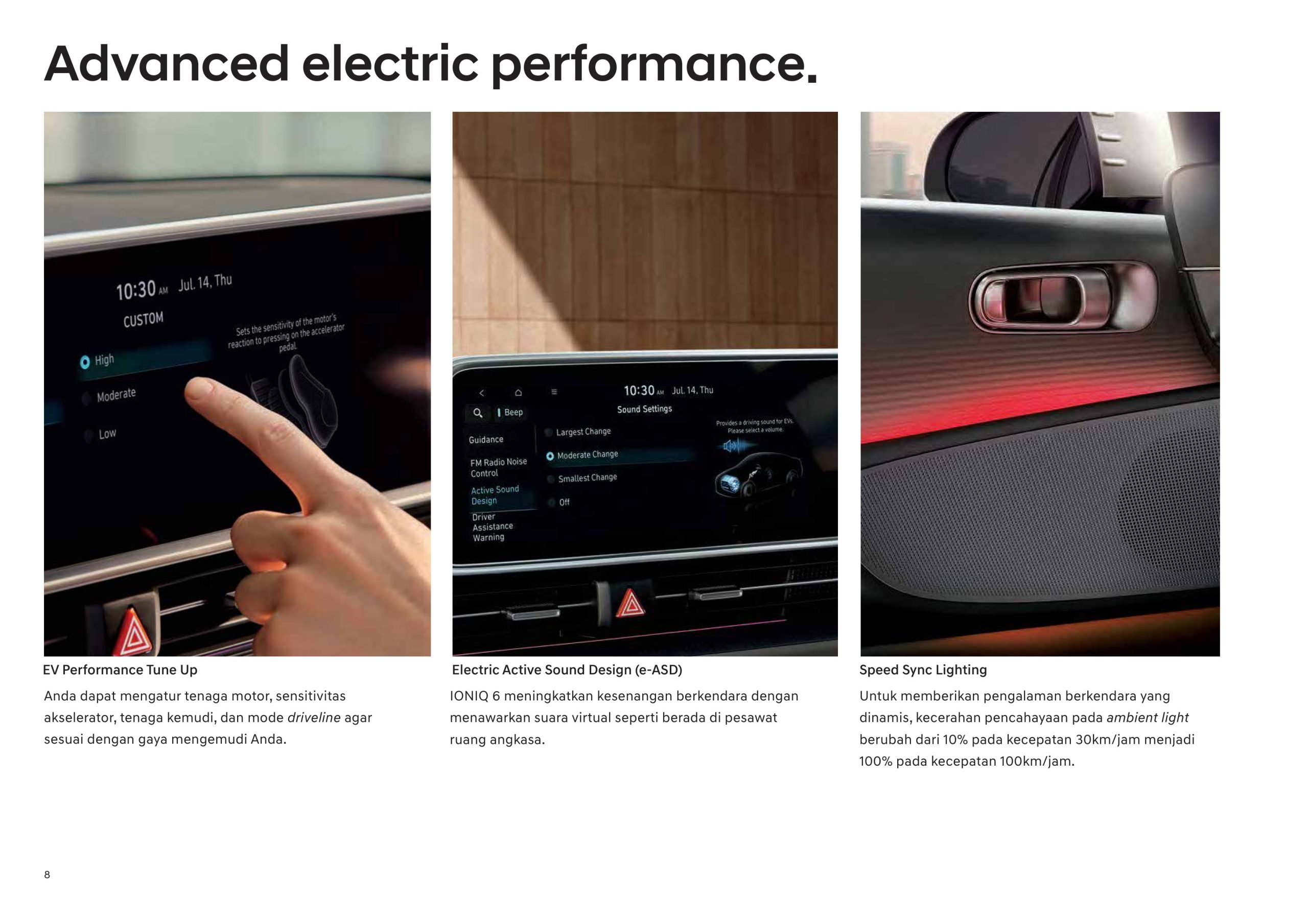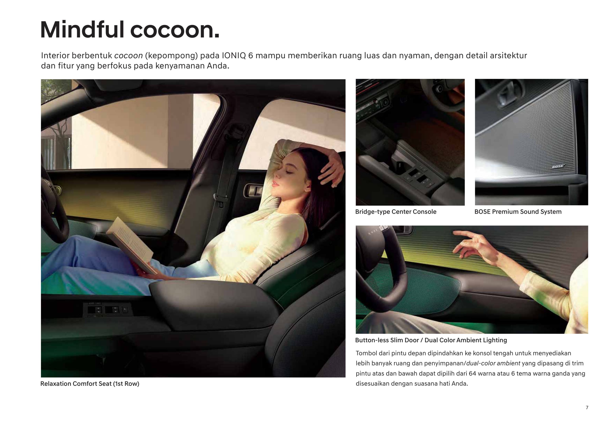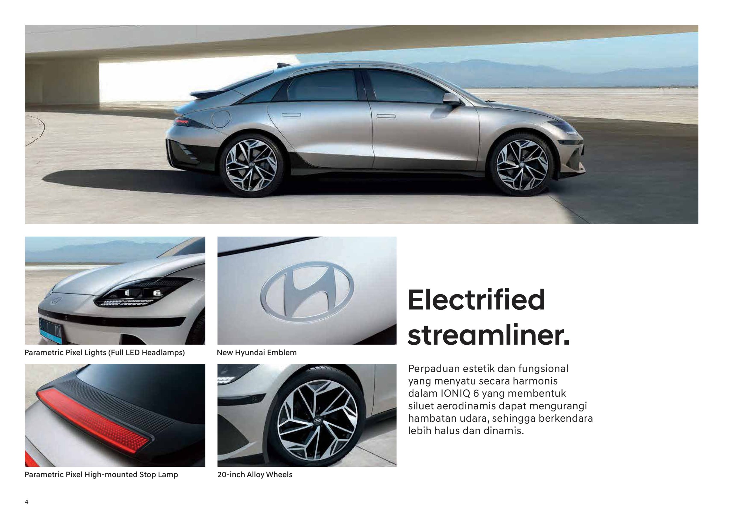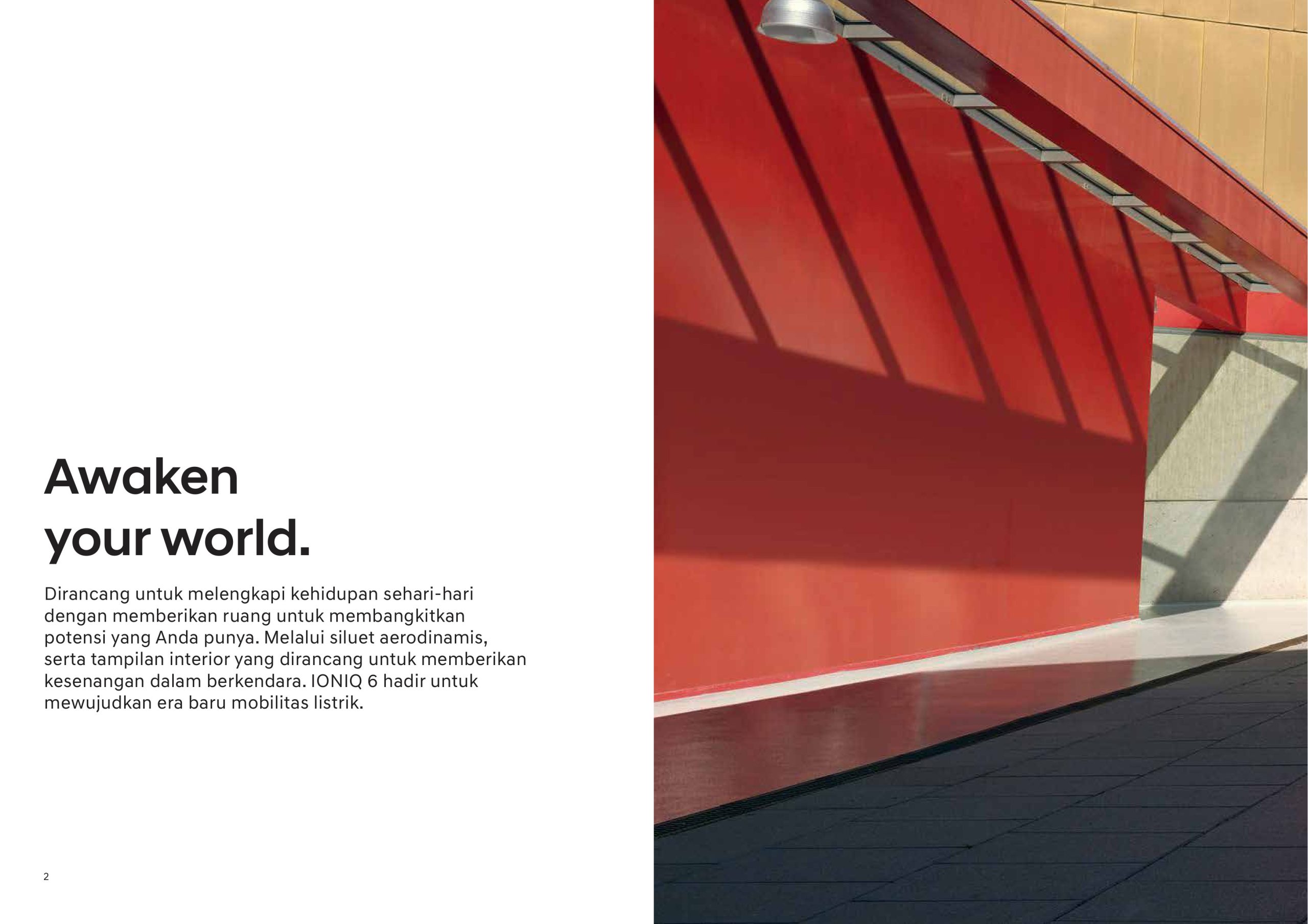 Dirancang untuk melengkapi kehidupan sehari-hari dengan memberikan ruang untuk membangkitkan potensi yang Anda punya. Melalui siluet aerodinamis, serta tampilan interior yang dirancang untuk memberikan kesenangan dalam berkendara. IONIQ 6 hadir untuk mewujudkan era baru mobilitas listrik.